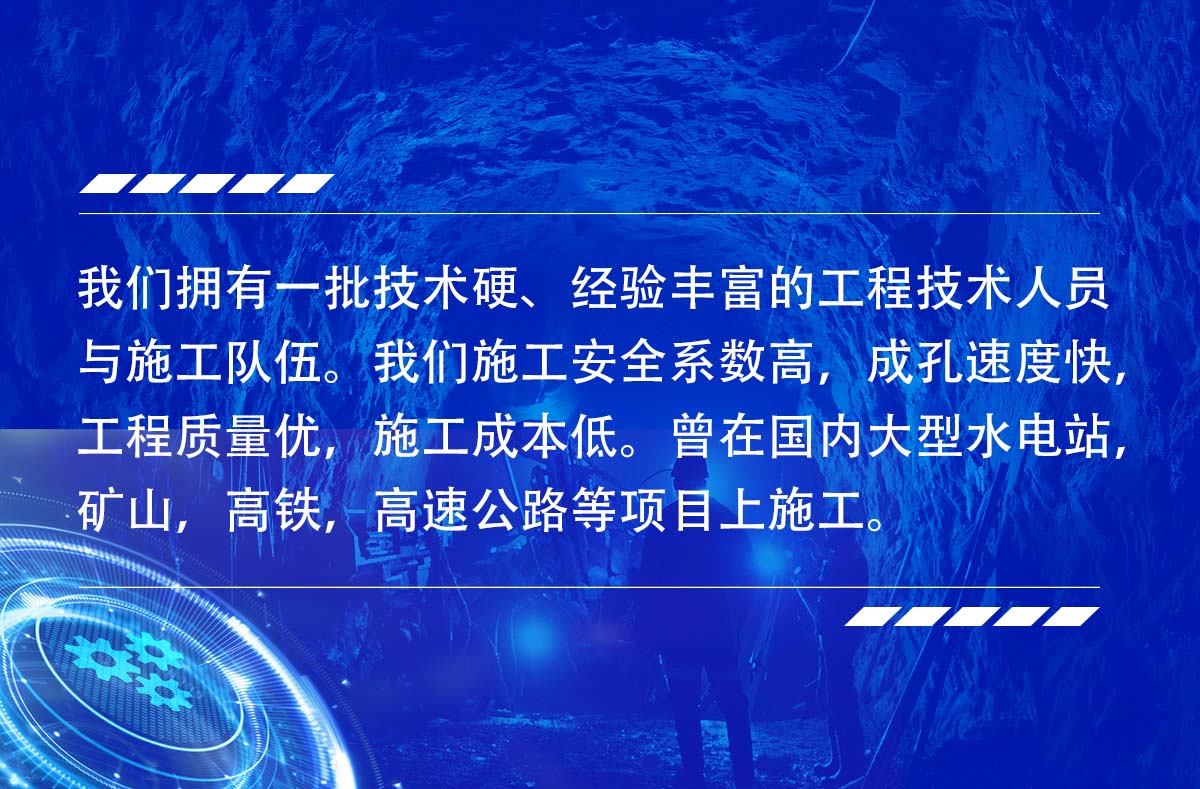 淮北市勤拓礦山工程有限公司是一家從事多年反井鉆機施工的服務生產型公司,公司目前有十幾臺鉆機設備,ZFY120/30/150型反井(天井)鉆機5臺,ZFY1.8/40/250型反井(天井)鉆機4臺,ZFY2.5/70/200型反井(天井)鉆機2臺,ZFY3.0/120/400型反井鉆機1臺,ZFY3.5/120/400型反井(天井)鉆機1臺,可承接深度0-300米,成孔直,0.9~4米.1.2~3米的各種豎井、井下煤倉、溜煤眼、通風井、調壓井、電纜井、泄水井等。我們擁有一批技術硬、經驗豐富的工程技術人員與施工隊伍。我們施工安全系數高,成孔速度快,工程質量優,施工成本低。曾在國內大型水電站,礦山,高鐵,高速公路等項目上施工。